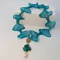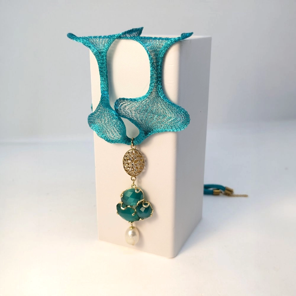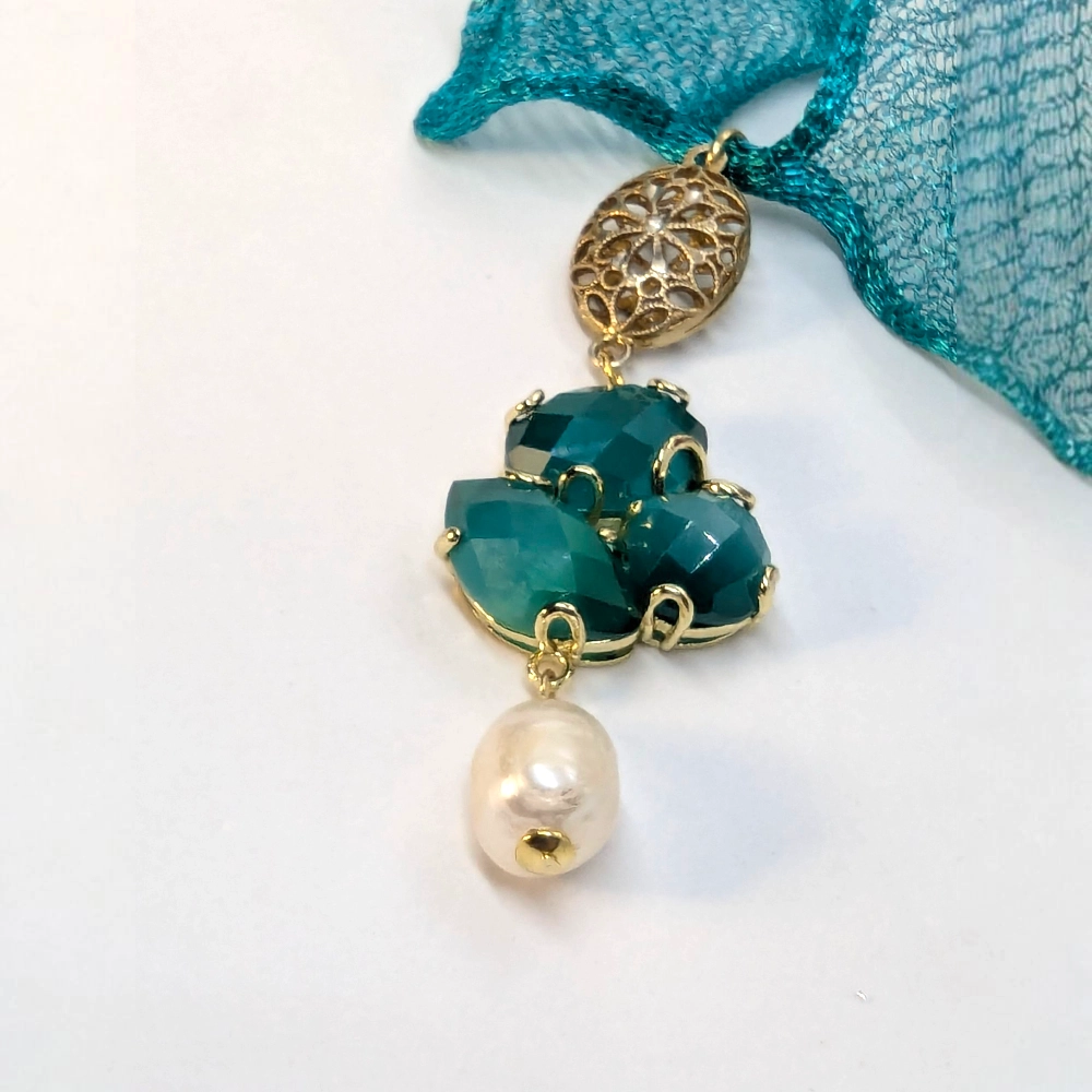 - Pendente Prezioso: Connettore ovale in filigrana d’argento 925 dorato, tre pietre di quarzo occhio di gatto verde smeraldo e perla barocca.
