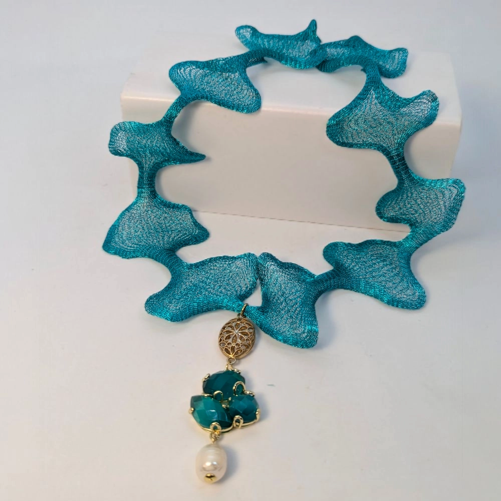 Il cuore di questa collana è il suo pendente, un vero capolavoro: un raffinato connettore ovale in filigrana d’argento 925 dorato che incornicia tre splendide pietre di quarzo occhio di gatto verde smeraldo. A completare questo design prezioso, un’elegante perla barocca come terminale, aggiungendo un tocco di lusso e naturalezza. Un gioiello che cattura la luce ad ogni movimento e si adatta con versatilità ad ogni look, dal quotidiano all’occasione speciale.