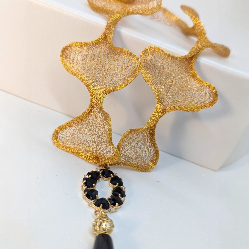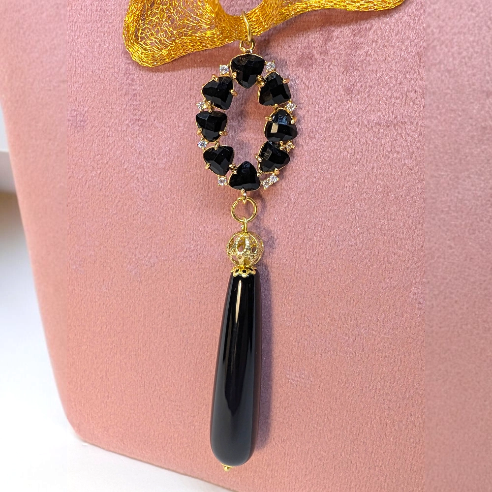 - Materiali Preziosi: Onice nero, filigrana di titanio, pendente in ottone placcato oro.