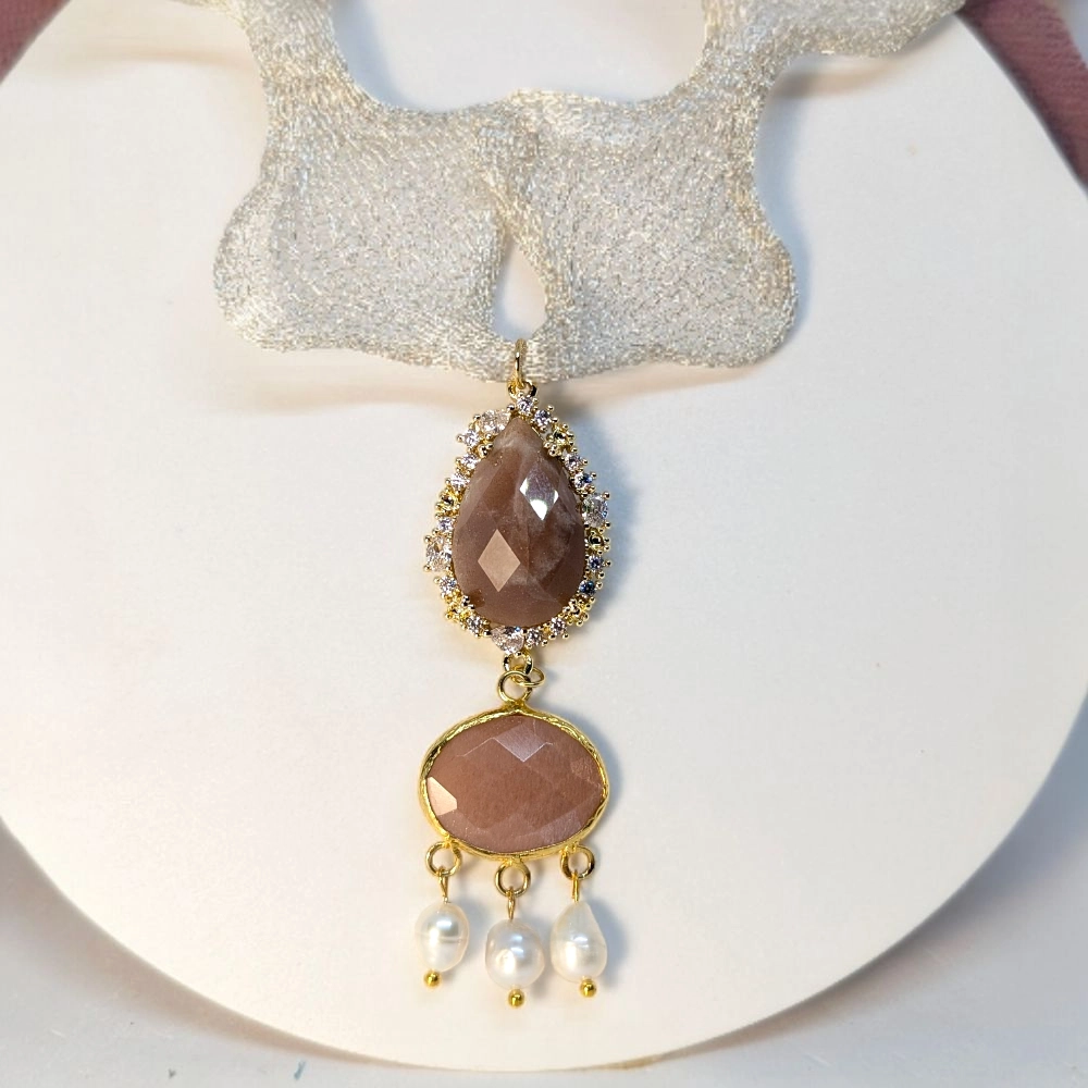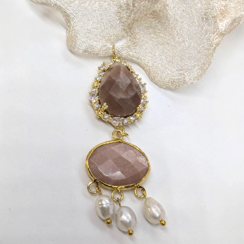 Al centro di questa splendida creazione, un pendente impreziosito da una Pietra del Sole, nota per le sue calde sfumature e per il suo significato simbolico di gioia e ottimismo. Questa gemma, con la sua brillantezza unica, è incastonata in una montatura dorata che ne esalta la bellezza. A completare il tutto, un tocco di perle d’acqua dolce che aggiunge un’eleganza classica e senza tempo.