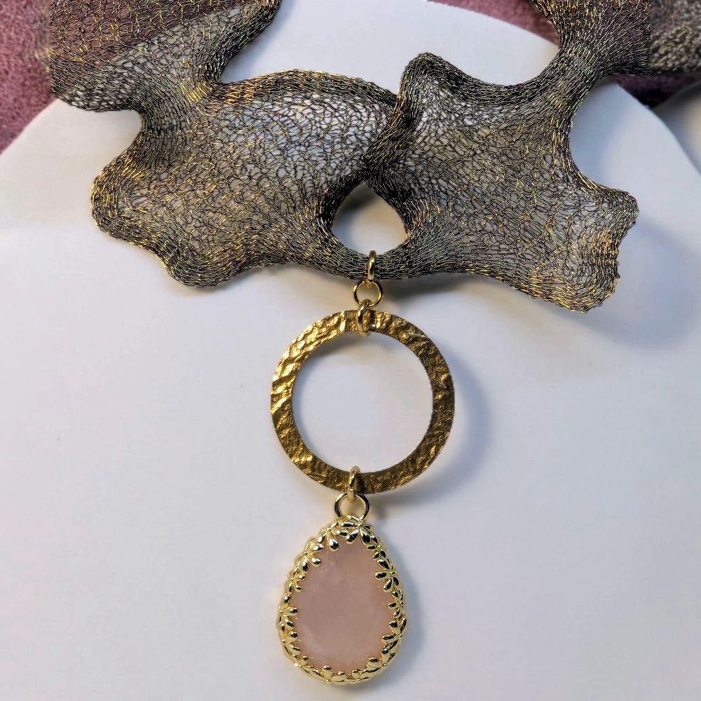 - Pendente Esclusivo: Goccia di quarzo rosa, motivo floreale e cerchio in argento 925 placcato oro.